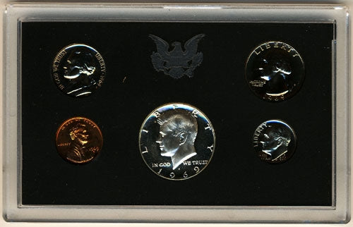 5 coin set includes 1969 Proof Lincoln cent, Jefferson nickel, Roosevelt dime, Washington quarter and Kennedy half dollar in original government issue packaging.
