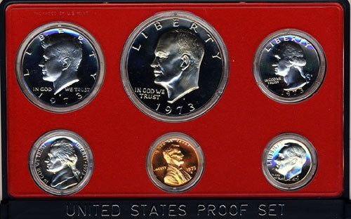6 coin set includes 1973 Proof Lincoln cent, Jefferson nickel, Roosevelt dime, Washington quarter, Kennedy half dollar and Eisenhower dollar in original government issue packaging.