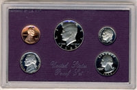 5 coin set includes 1986 Proof Lincoln cent, Jefferson nickel, Roosevelt dime, Washington quarter and Kennedy half dollar in original government issue packaging.