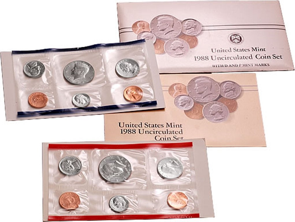 Single envelope set containing 10 uncirculated coins packaged by the U.S. Mint plus the P & D Medallion. - Set includes a complete set of all 1988 coins issued from the Philadelphia Mint ("P" mint mark) and Denver Mint ("D" mint mark).