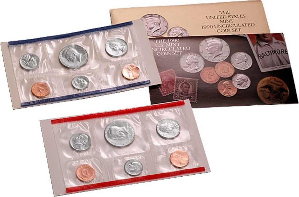 Single envelope set containing 10 uncirculated coins packaged by the U.S. Mint plus the P & D Medallion. - Set includes a complete set of all 1990 coins issued from the Philadelphia Mint ("P" mint mark) and Denver Mint ("D" mint mark).
