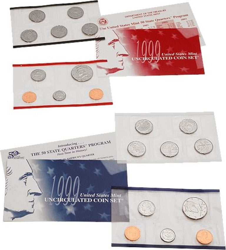 Two envelope set containing 18 uncirculated coins packaged by the U.S. Mint. - Set includes a complete set of all 1999 coins issued from the Philadelphia Mint ("P" mint mark) and Denver Mint ("D" mint mark).