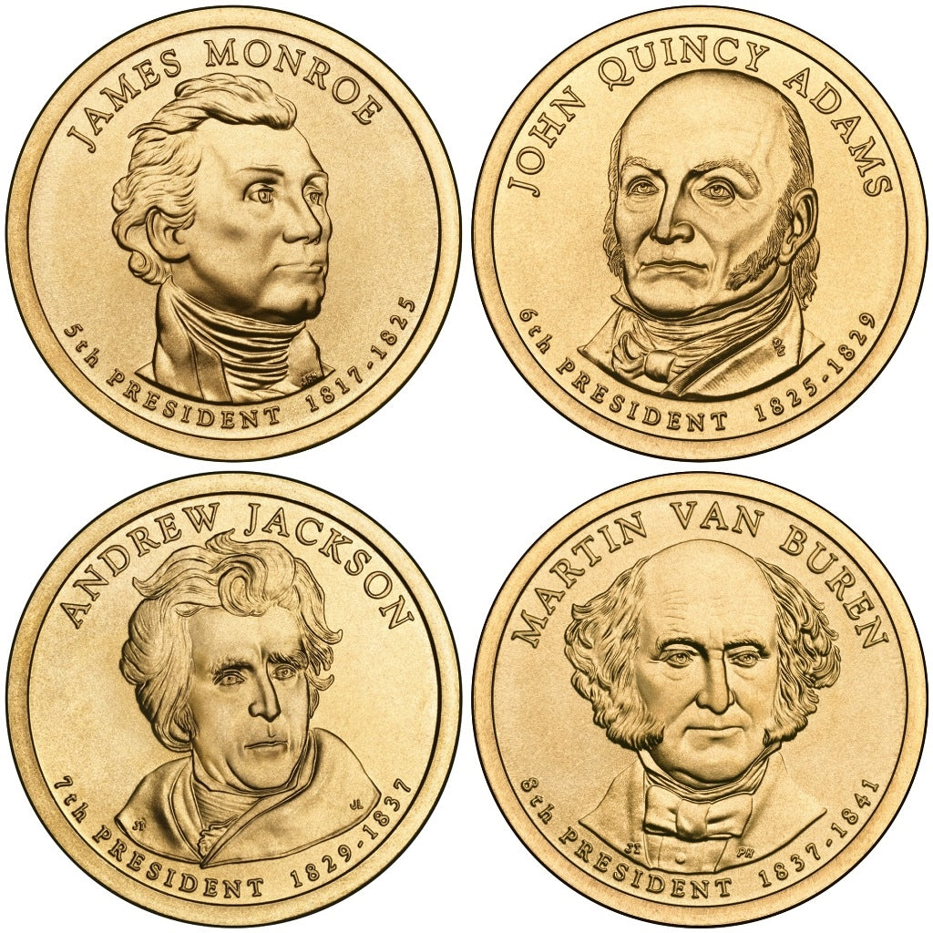 Contains all four Uncirculated 2008 dollars: Monroe, Q. Adams, Jackson, Van Buren. - "D" mint mark coins are from the Denver Mint.