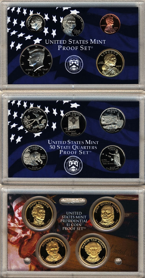 This is now the rarest proof set in the past 50 years!!!! Prices are rising fast for this low mintage issue. U.S. Mint 2008 14-coin Proof Sets are an amazing value. Three plastic cases full of all 14 proof coins issued for 2008! All 14 Gem Proof coins issued from the San Francisco (S) Mint in 2008. One innovative case, allowing an edge-view of all the coins, holds four 2008-S Presidential Dollars : James Monroe, John Quincy Adams, Andrew Jackson and Martin VanBuren A second case holds all five 2008-S State Quarters: Oklahoma, New Mexico, Arizona, Alaska and Hawaii. A third case holds the 2008-S Lincoln Cent, Roosevelt Dime, Kennedy Half, the Jefferson Nickel and the Sacagawea Dollar. Comes complete in government packaging with Certificate of Authenticity from the US Mint. Be sure to order enough for birthdays, anniversaries, new babies, and Christmas gifts this year!