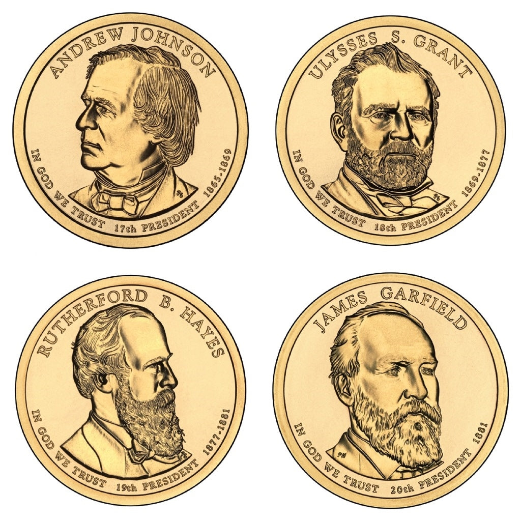 Contains 8 Uncirculated 2011 dollars, one from Each Mint: Johnson, Grant, Hayes, Garfield. - The 2011 obverses (heads sides) of these coins honor these Presidents: