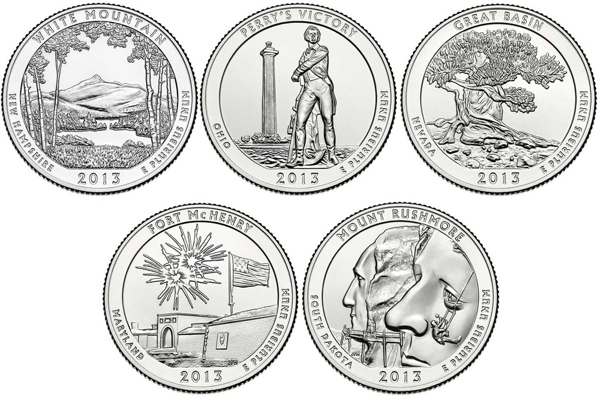 - A complete P&D set of the 10 BU National Parks Quarters issued in 2013: White Mountain National Forest (NH), Perrys Victory and International Peace Memorial (OH), Great Basin National Park (NV), Fort McHenry National Monument and Historic Shrine (MD), Mount Rushmore National Memorial (SD).