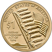 to represent the dual citizenship of Native Americans. - Inscriptions include “United States of America,” “$1,” and “Indian Citizenship Act of 1924.”